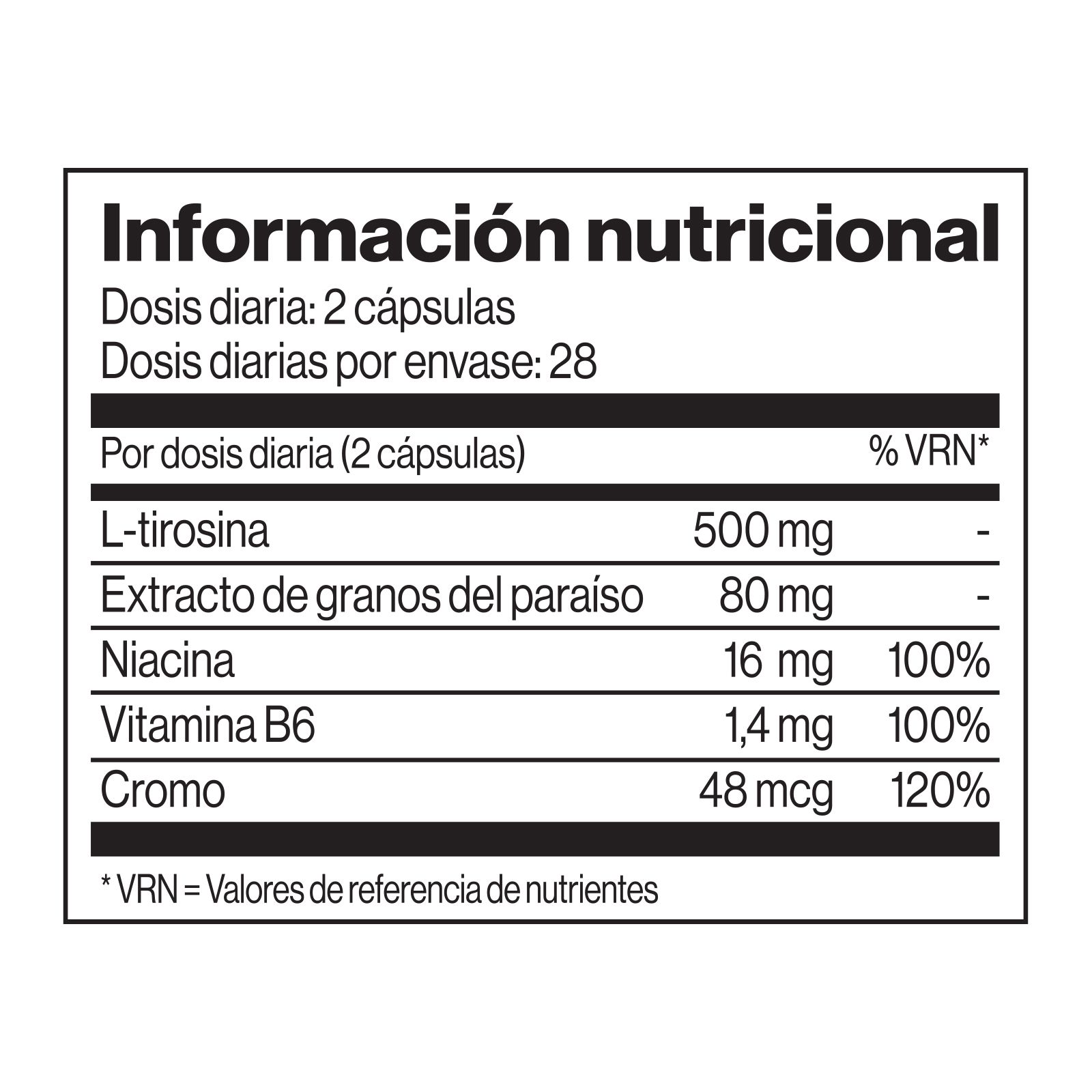 - Otros ingredientes: L-tirosina, salvado de arroz (Oryza sativa), agente de recubrimiento (hidroxipropilmetilcelulosa), extracto de granos del paraíso (Aframomum melegueta), levadura enriquecida con cromo, antiaglomerante (dióxido de silicio), niacina (nicotinamida), vitamina B6 (clorhidrato de piridoxina).