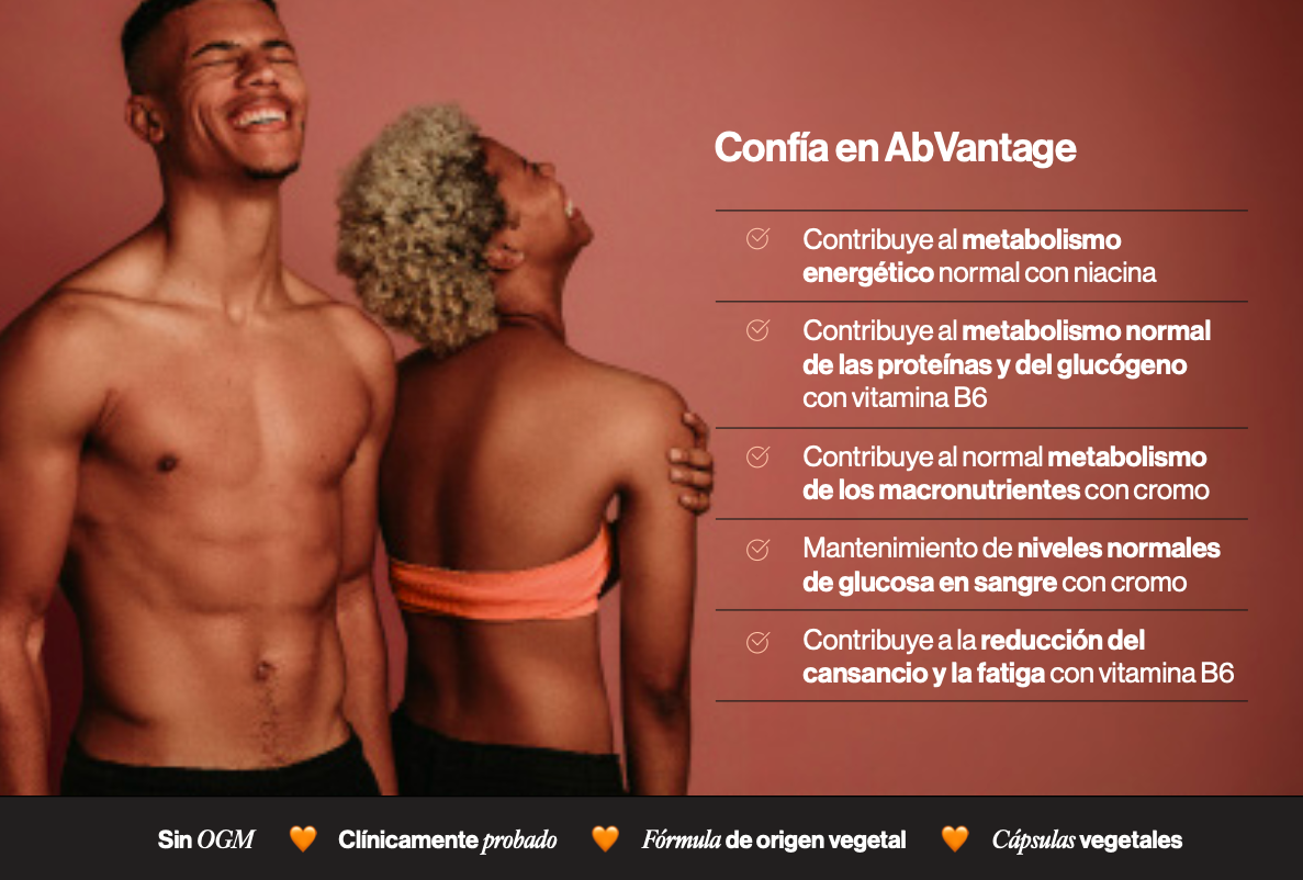 AbVantage contiene una fórmula de origen vegetal, clínicamente probada y sin estimulantes. Sus ingredientes activos incluyen granos del paraíso, vitaminas B3 y B6, y cromo.