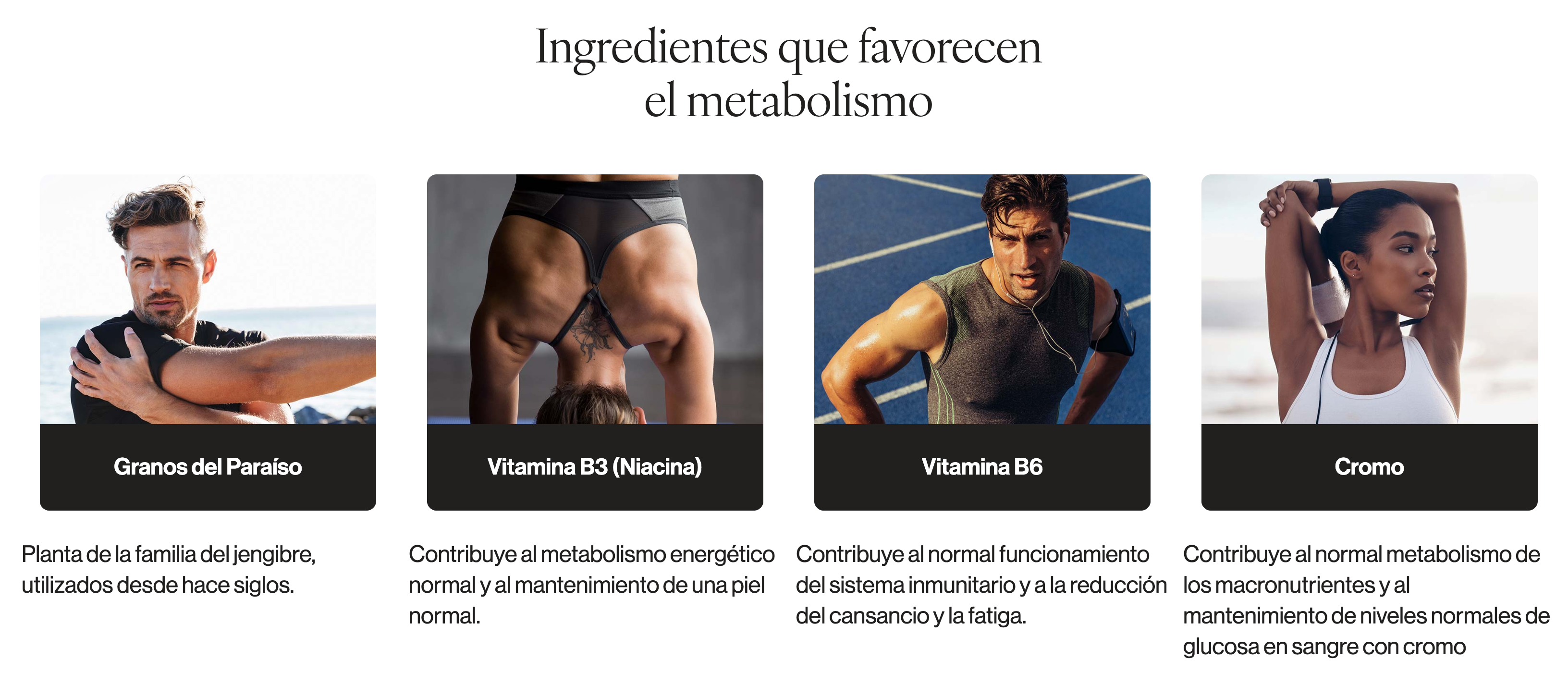 - Otros ingredientes: L-tirosina, salvado de arroz (Oryza sativa), agente de recubrimiento (hidroxipropilmetilcelulosa), extracto de granos del paraíso (Aframomum melegueta), levadura enriquecida con cromo, antiaglomerante (dióxido de silicio), niacina (nicotinamida), vitamina B6 (clorhidrato de piridoxina).
