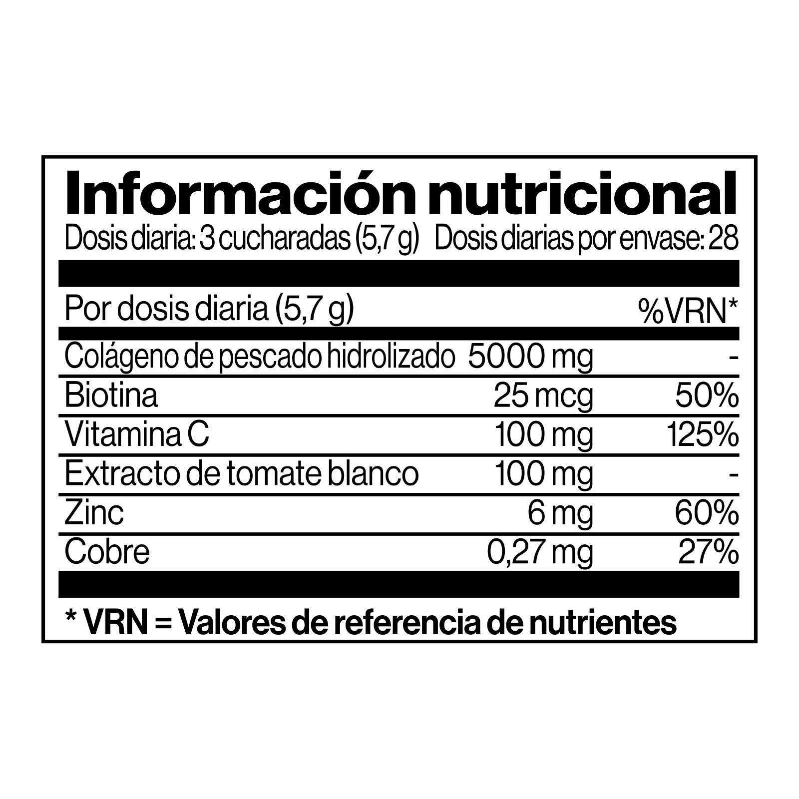Estamos redefiniendo el cuidado de la piel con ingredientes que van más allá de la superficie. Colágeno de pescado hidrolizado, aroma, aroma, vitamina C (L-ascorbato cálcico), extracto de tomate blanco (Solanum lycopersicum, fruta), edulcorante (glucósidos de esteviol procedentes de Estevia), espesante (goma xantana), zinc (gluconato de zinc), aroma, cobre (gluconato cúprico), biotina (D-biotina).