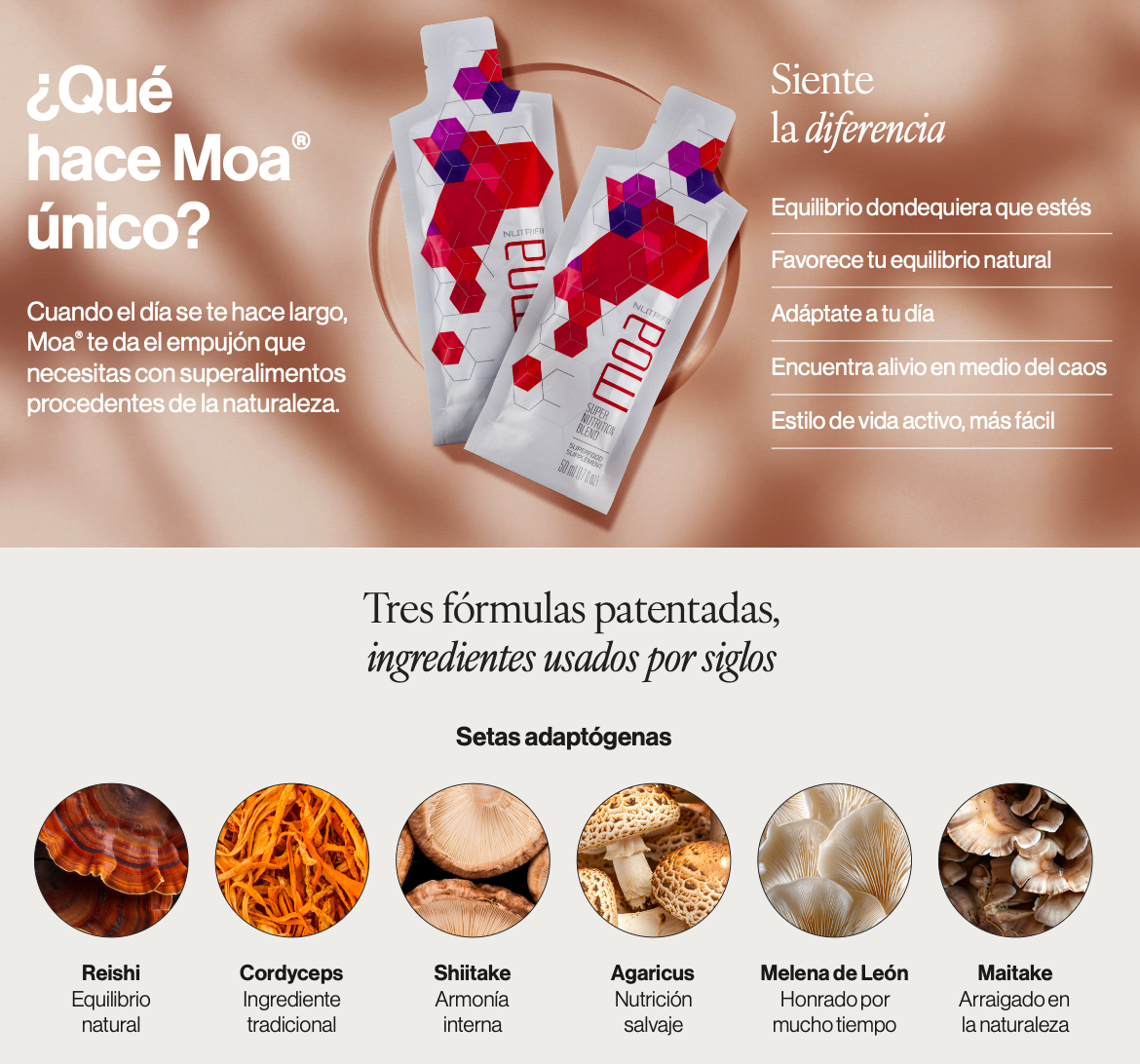 ¡Cada pequeña bolsita tiene un gran efecto! Moa® es el suplemento ideal para ayudar a proteger las células del estrés oxidativo, estimular tu metabolismo y energía y dar apoyo a la función inmunitaria normal. Con 36 de los ingredientes más potentes del mundo combinados en una mezcla de purés, extractos y jugos, es, con mucho, el superalimento más exclusivo del mercado actual. Y gracias a nuestra práctica bolsa Go Pouch de una sola porción, son fáciles de consumir y de compartir, lo que significa que puedes disfrutar de Moa en cualquier momento y en cualquier lugar.