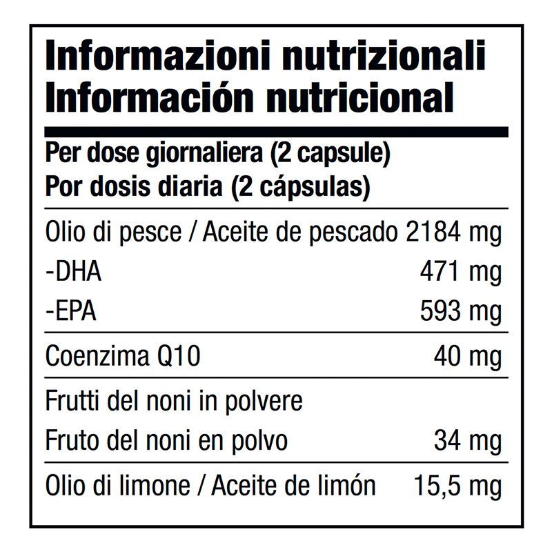 Aceite de pescado, envoltura de la cápsula (gelatina bovina, emulgente (glicerina), agua purificada, colorante (clorofilas)), estabilizante (cera de abeja amarilla), coenzima Q10, emulgente (lecitinas), fruto de la Morinda citrifolia en polvo aceite de limón (Citrus limon).