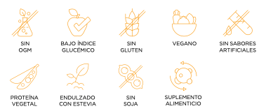 Aislado de proteína de guisantes fructooligosacáridos, aroma, emulgente (lecitina), aceite de la microalga Schizochytrium sp., espesante (goma xantana, goma guar), mezcla de vitaminas y minerales [L-ascorbato cálcico, gluconato de cinc, D-biotina, acetato de D-alfa-tocoferilo, nicotinamida, D-pantotenato cálcico, colecalciferol, riboflavina, piridoxina, clorhidrato de tiamina, betacaroteno, picolinato de cromo, yoduro de potasio], cacao magro en polvo (Theobroma cacao), óxido de magnesio, edulcorante (glucósidos de esteviol), aceite de coco en polvo (Cocos nucifera), sales cálcicas de ácido ortofosfórico, mezcla de enzimas [alfa-amilasa, proteasa neutra, lactasa, lipasa, celulasa, maltodextrina], salvado de arroz (Oryza sativa), colorante (carotenos), arándano en polvo (Vaccinium macrocarpon), L-triptófano, Lactobacillus plantarum.