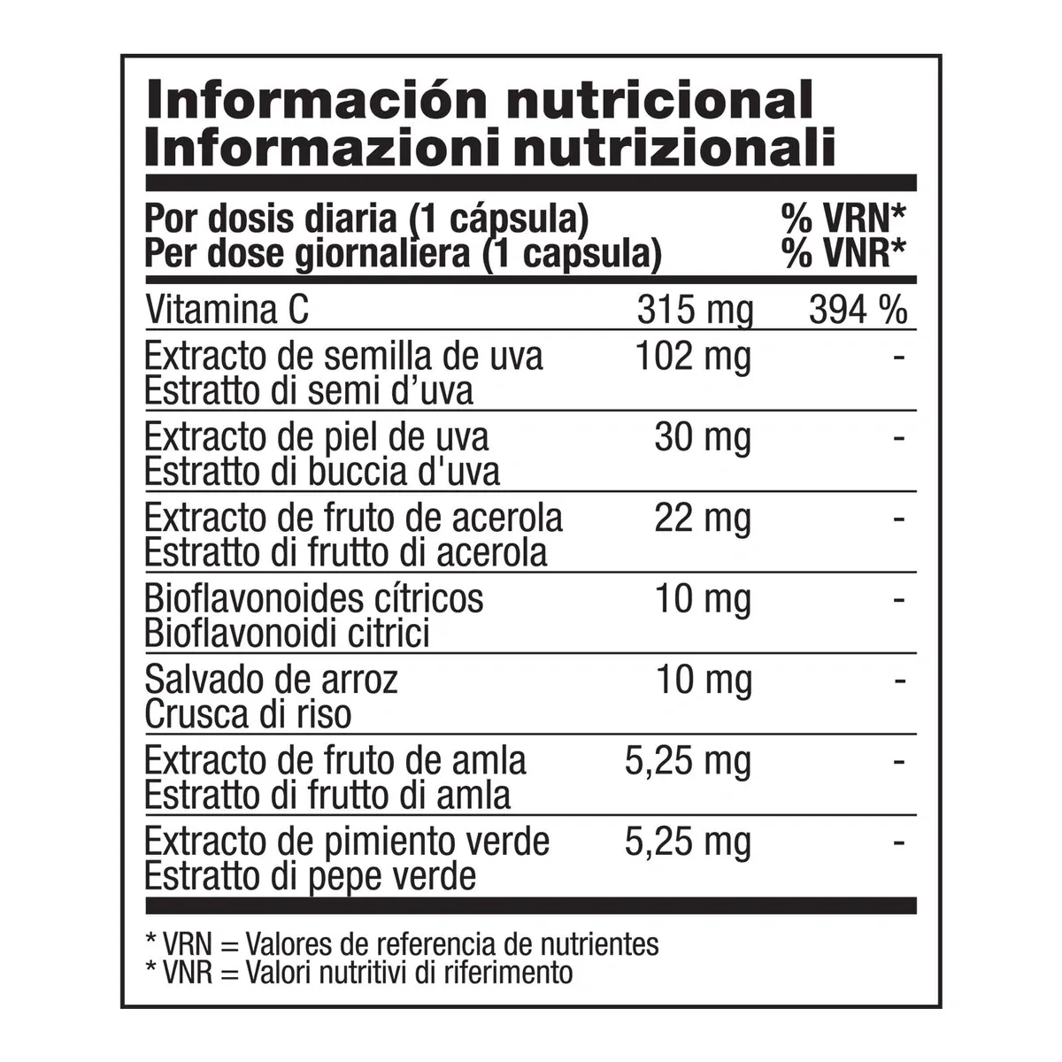 - 315 mg de vitamina C, 102 mg de extracto de semilla de uva, 30 mg de extracto de piel de uva, 10 mg de bioflavonoides cítricos